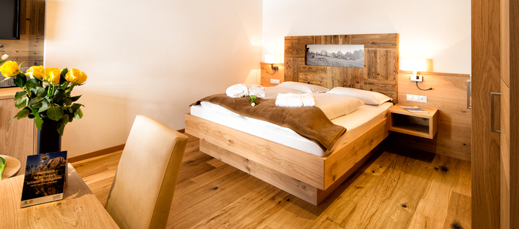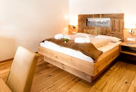Our generously-sized rooms (23-27m²) with large east or west balcony and a magnificent panoramic view are very peaceful. Warm colors and woods of the region as well as natural wooden floors provide a harmonious well-being. Two extra beds are available in each double bedroom to comfortably accommodate two additional people. Each room offers a telephone, W-Lan, safe, TV, spacious bathroom with shower, WC and bidet, hairdryer, shampoo as well as bathrobe and bath towels for the vitality area.