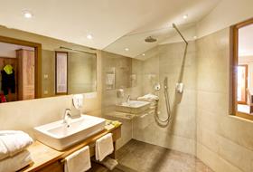 Our generously-sized (23-27m²) comfort rooms have a large balcony/terrace with south-west or west panoramic view. Warm colors and woods of the region as well as the wooden floor provide a harmonious well-being. Two extra beds are available in each double bedroom to comfortably accommodate two additional people. Each room has a telephone, W-Lan, safe, TV and a spacious bathroom with shower, WC and bidet, hairdryer, shampoo as well as bathrobe and bath towels for the vitality area.